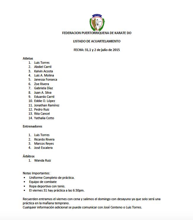 Se adjunta Boletín con listado del acuartelamiento para el fin de semana del 31 de julio al 2 de agosto de 2015