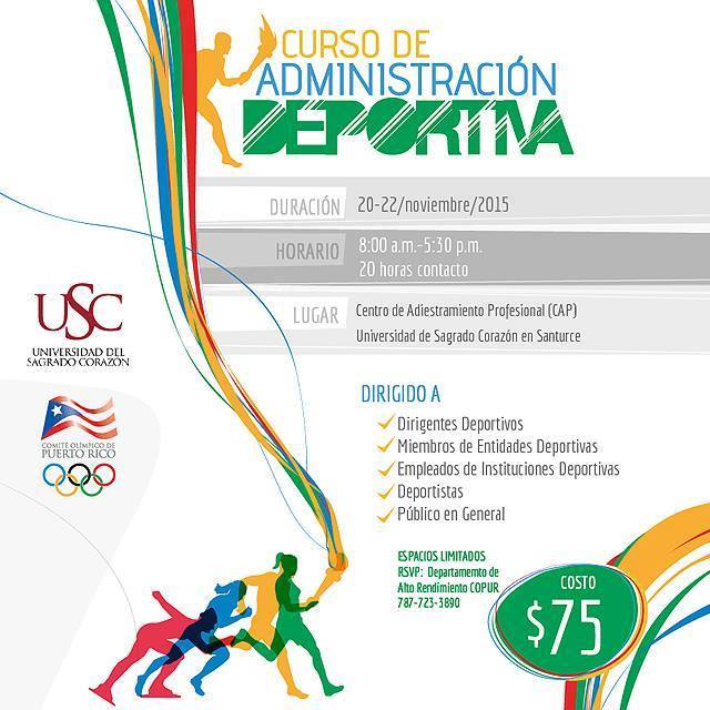 El Departamento de Alto Rendimiento (DAR) del Comité Olímpico de Puerto Rico anunció el curso de Administración Deportiva a celebrarse del 20 al 22 de noviembre en el Centro de Adiestramiento Profesional en la Universidad del Sagrado Corazón, Santurce.