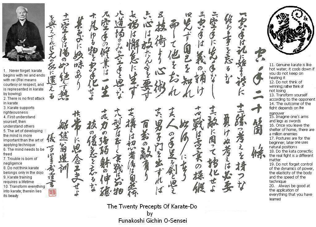 Al maestro Funakoshi se le atribuye la reformulación moderna de los antiguos 20 enunciados del Bushido (Niju kun), adaptados a su estilo de kárate, el Shotokan. Hoy, la Federación Japonesa de Kárate (JKA) los sintetiza en cinco principios que podrían compartir todas las escuelas: esfuerzo por mejorar el carácter, defensa de la verdad por todas las vías, reiterado espíritu de sacrificio, cortesía y respeto a los demás, y autocontrol para reprimir actitudes violentas. Cada principio viene precedido del kanji “hitotsu” (uno, traducible como “ante todo” o “lo primordial”) para denotar que todos tienen el mismo valor o que hay que “ser uno” con cada enunciado.