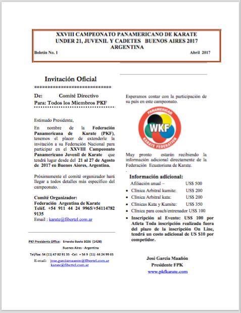 ver invitación aquí: PKF Invitacion XXVIII Campeonato Panamericano de Karate Under 21,Juvenil y Cadetes Buenos Aires 2017