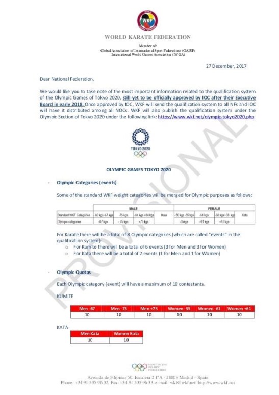Información preliminar sobre el proceso de calificación olímpica del WKF – esta información es provisional y se confirmará una vez que la junta ejecutiva del COI apruebe el proceso a principios de 2018. Recuerde que esta información puede cambiar