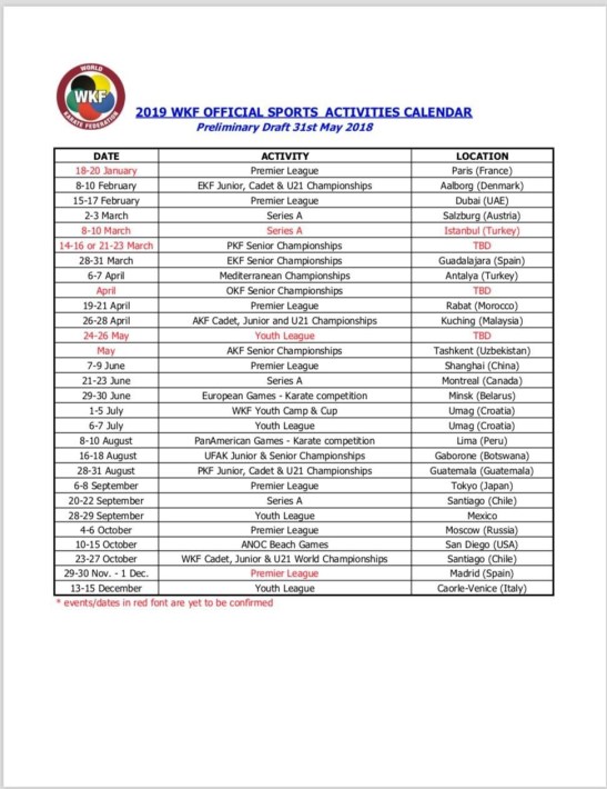 Adjunto el borrador del Calendario WKF 2019. Tenga en cuenta que este es solo un borrador preliminar sujeto a los ajustes necesarios más adelante en el año.
