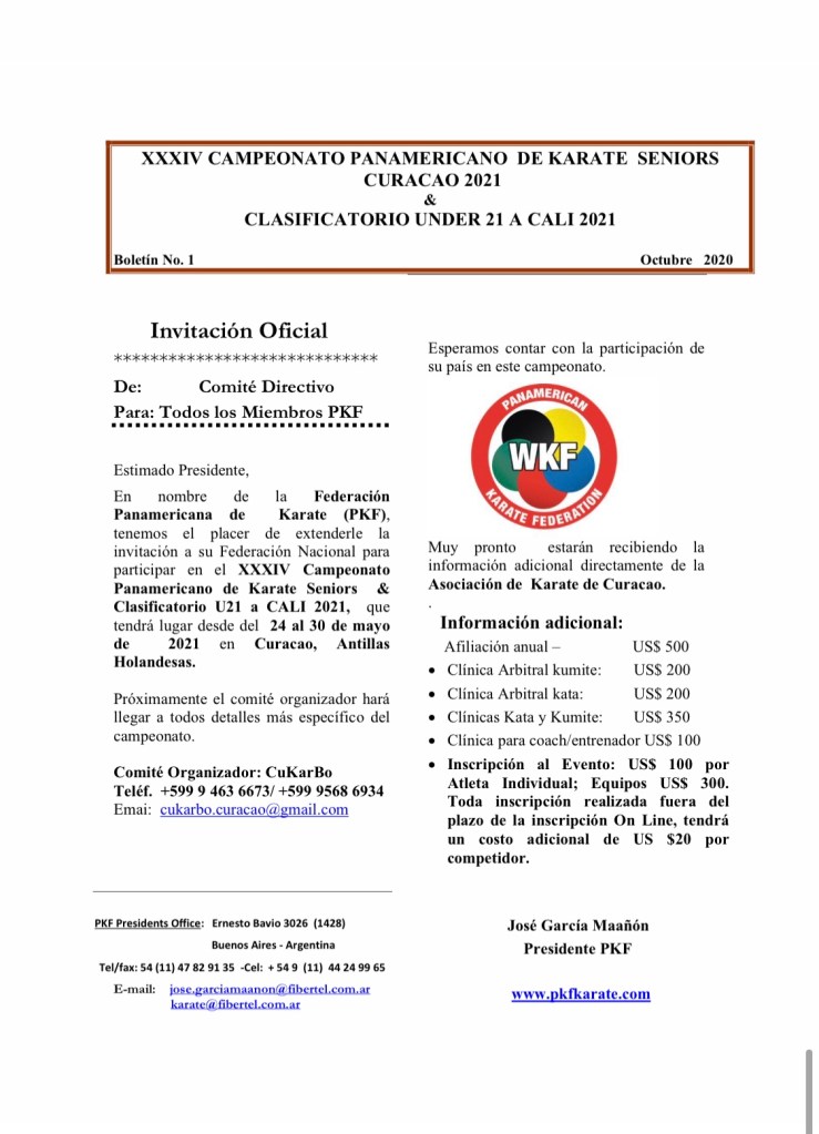 Boletín XXIV Campeonato Panamericano de Karate Seniors Curacao 2021 “ y “ Campeonato Under 21 Clasificatorio a Cali 2021 “