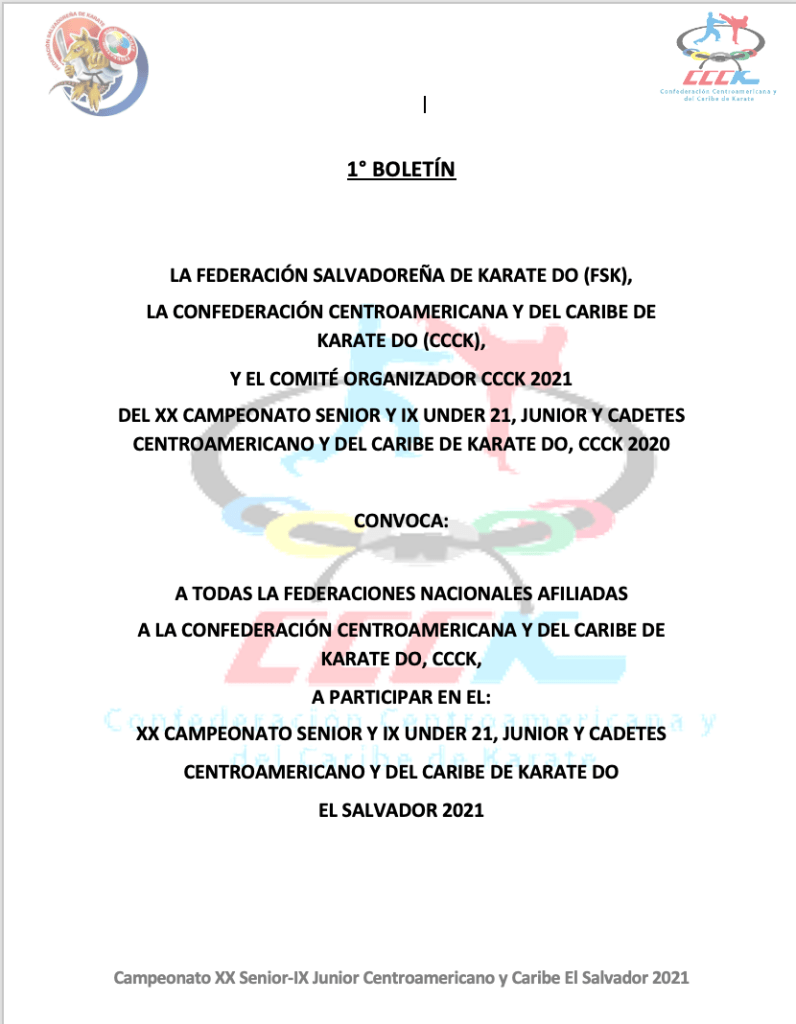 XX Campeonato Senior y IX Junior Centroamericano y del Caribe de Karate Do, CCCK EL SALVADOR 2021, que tendrá lugar en la Ciudad de San Salvador, República de El Salvador, en las fechas comprendidas del 19 al 25 de abril de 2021.