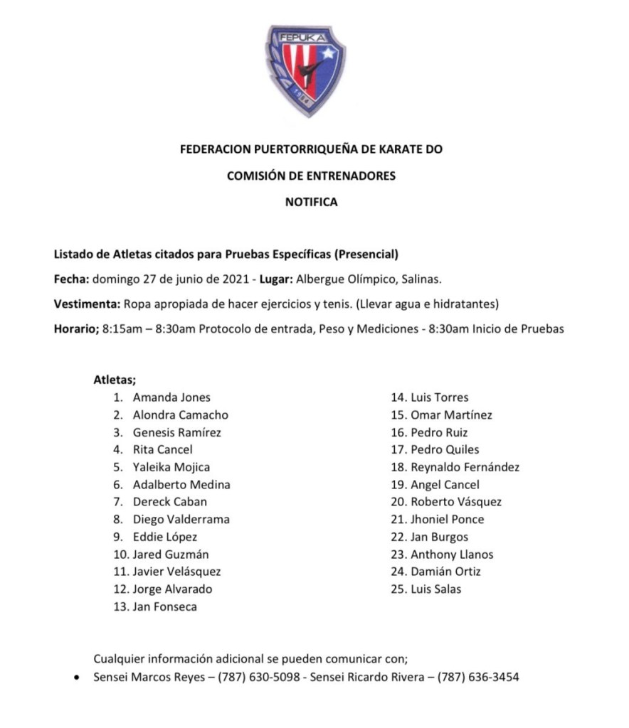 FEPUKA INFORMA:Listado de atletas pruebas específicas ( presencial)