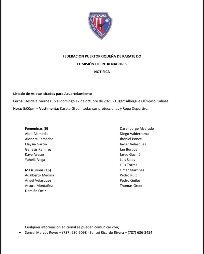 Adjunto notificación de acuartelamiento para grupo específico en este mes de octubre y notificación para práctica general del domingo 17 de octubre.